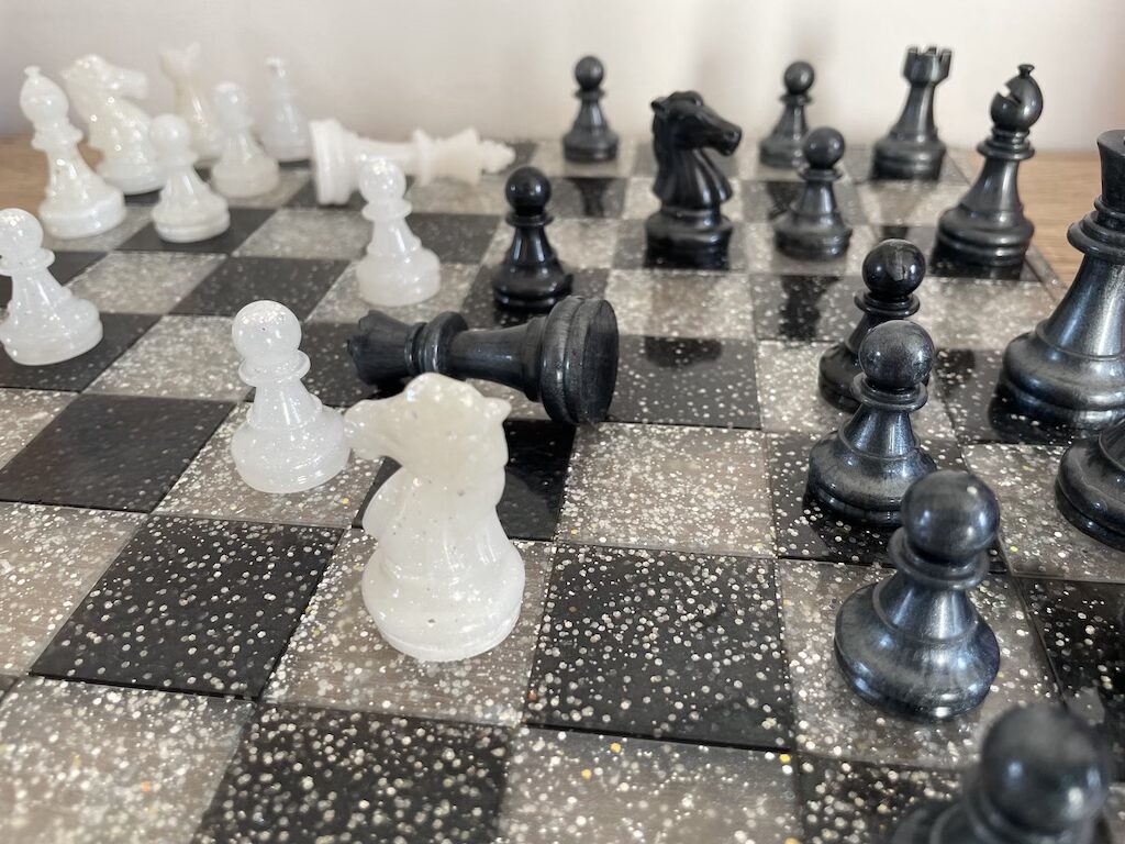Redécouvrez le roi des jeux avec cette création unique, entièrement façonnée à la main en résine époxy. Entre l’intensité du gris anthracite, la pureté du blanc et l’éclat subtil des paillettes, cet échiquier de 30,7 cm est autant un objet de stratégie qu’une pièce d’art moderne.